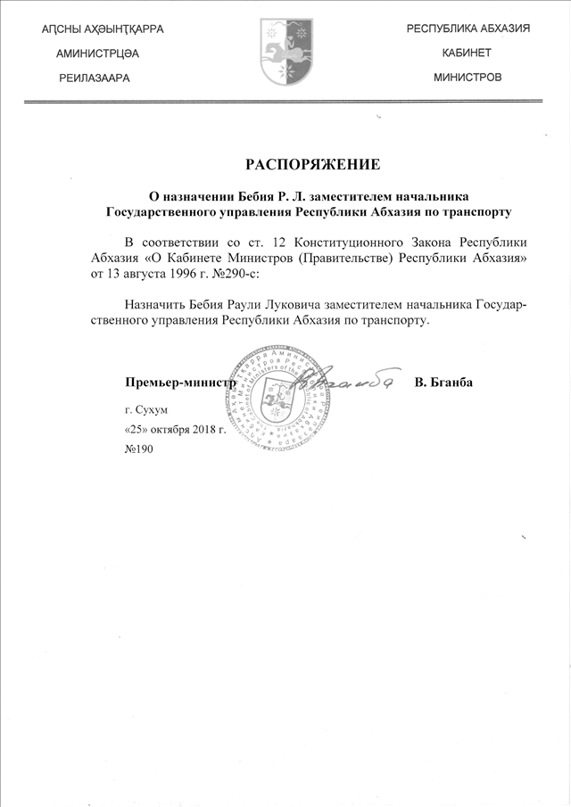 Распоряжение Кабинета Министров Республики Абхазия от 25.10.2018 № 190 "О назначении Бебия Р.Л. заместителем начальника Государственного управления Республики Абхазия по транспорту"