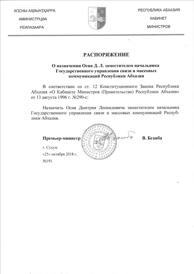 Распоряжение Кабинета Министров Республики Абхазия от 25.10.2018 № 191 "О назначении Осия Д.Л. заместителем начальника Государственного управления связи и массовых коммуникаций Республики Абхазия"