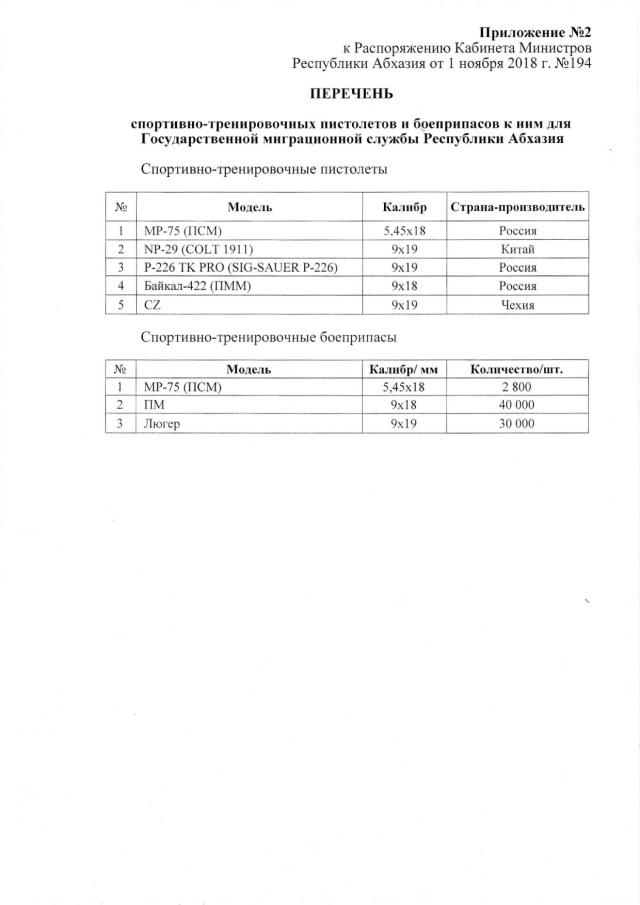 Распоряжение Кабинета Министров Республики Абхазия от 01.11.2018 № 194 "О разрешении ООО СП "АРС" на ввоз в Республику Абхазия спортивно-тренировочных пистолетов и боеприпасов к ним для служебных целей Государственного таможенного комитета Республики Абхазия и Государственной миграционной службы Республики Абхазия"
