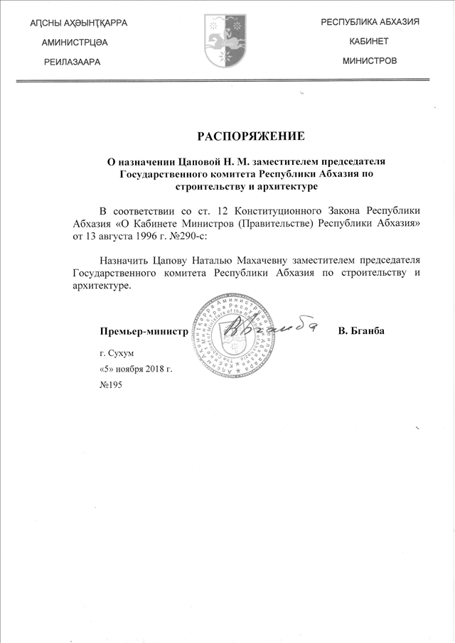 Распоряжение Кабинета Министров Республики Абхазия от 05.11.2018 № 195 "О назначении Цаповой Н.М. заместителем председателя Государственного комитета Республики Абхазия по строительству и архитектуре"
