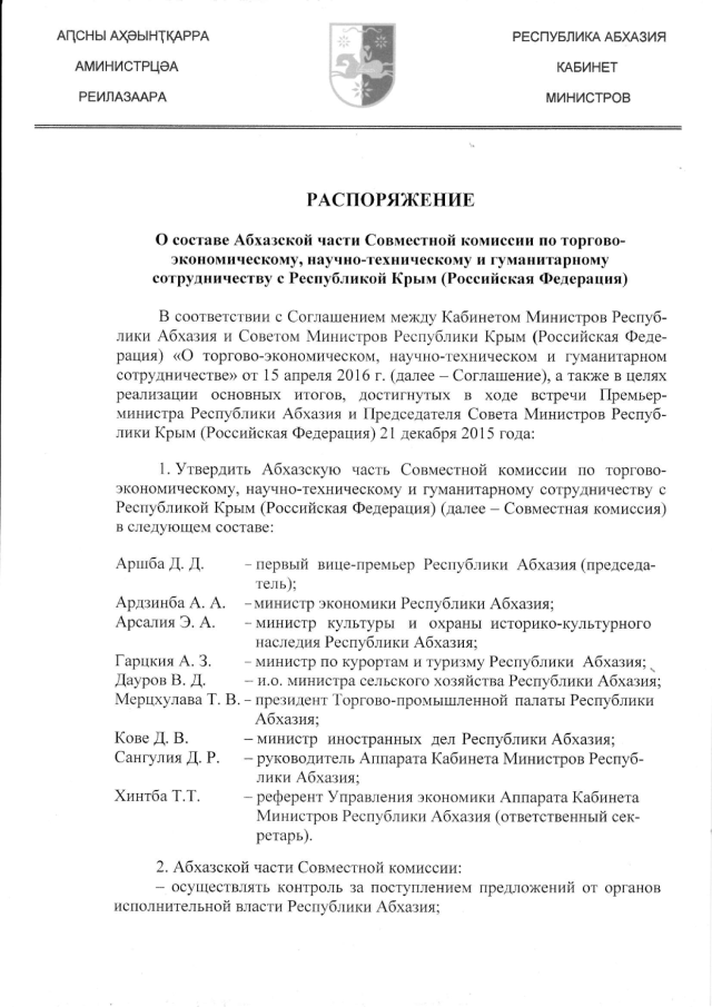 Распоряжение Кабинета Министров Республики Абхазия от 14.11.2018 № 199 "О составе Абхазской части Совместной комиссии по торгово-экономическому, научно-техническому и гуманитарному сотрудничеству с Республикой Крым (Российская Федерация)"
