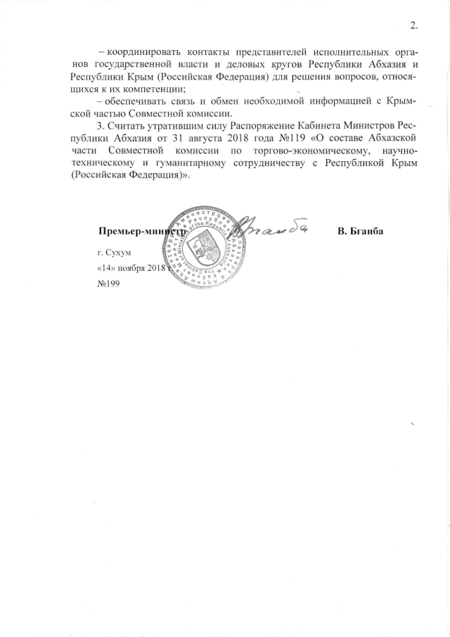 Распоряжение Кабинета Министров Республики Абхазия от 14.11.2018 № 199 "О составе Абхазской части Совместной комиссии по торгово-экономическому, научно-техническому и гуманитарному сотрудничеству с Республикой Крым (Российская Федерация)"