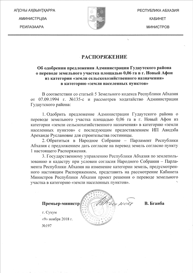 Распоряжение Кабинета Министров Республики Абхазия от 09.11.2018 № 197 "Об одобрении предложения Администрации Гудаутского района о переводе земельного участка площадью 0,06 га в г. Новый Афон из категории "земли сельскохозяйственного назначения" в категорию "земли населенных пунктов"