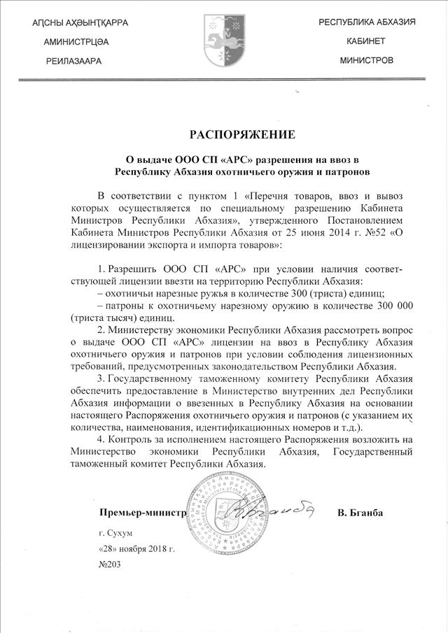 Распоряжение Кабинета Министров Республики Абхазия от 28.11.2018 № 203 "О выдаче ООО СП "АРС" разрешения на ввоз в Республику Абхазия охотничьего оружия и патронов"