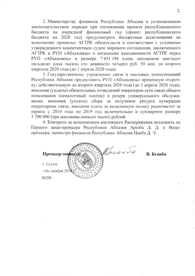 Распоряжение Кабинета Министров Республики Абхазия от 16.11.2018 № 200 "Об одобрении заключения Республиканским государственным учреждением "Абхазская государственная телерадиокомпания" мирового соглашения с Республиканским унитарным предприятием "Абхазсвязь"