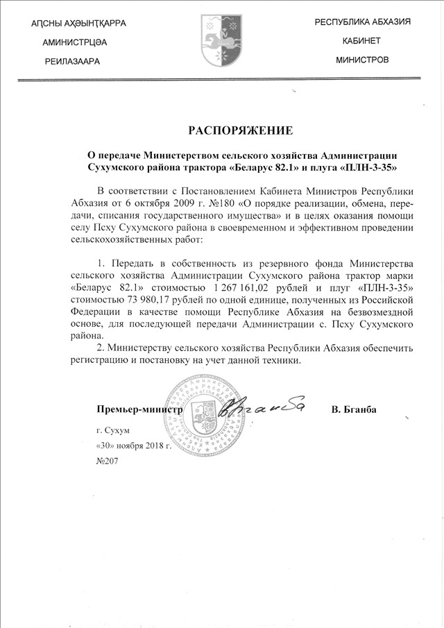 Распоряжение Кабинета Министров Республики Абхазия от 30.11.2018 № 207 "О передаче Министерством сельского хозяйства Администрации Сухумского района трактора "Беларус 82.1" и плуга "ПЛН-3-35"