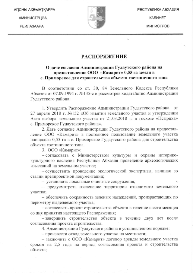 Распоряжение Кабинета Министров Республики Абхазия от 30.11.2018 № 210 "О даче согласия Администрации Гудаутского района иа предоставление ООО "Камарит" 0,55 га земли в с. Приморское для строительства объекта гостиничного типа"