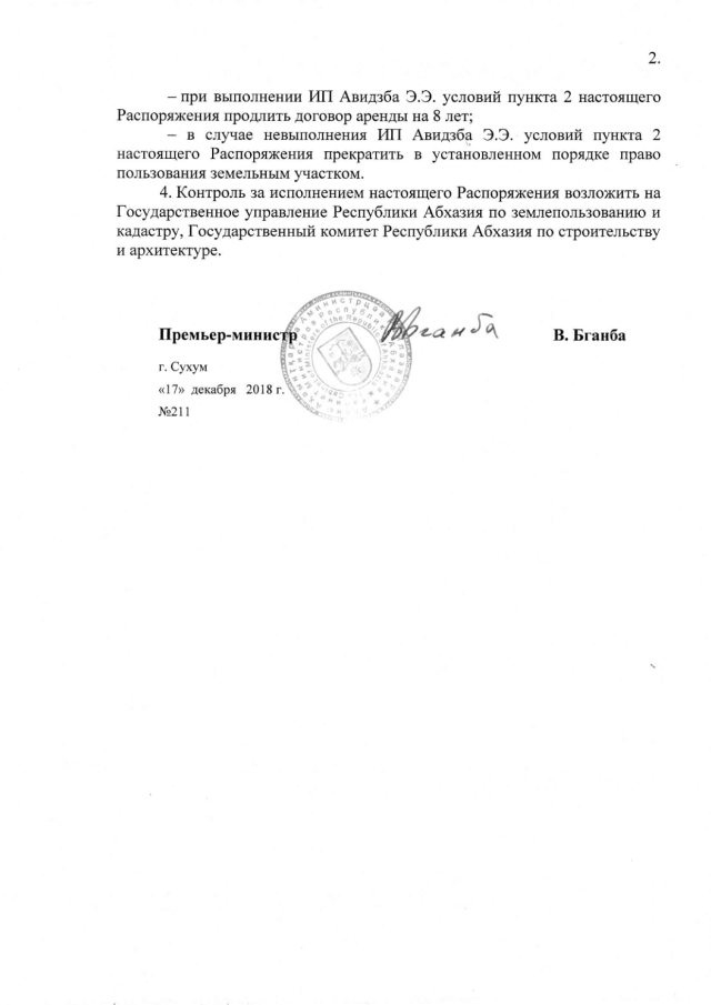 Распоряжение Кабинета Министров Республики Абхазия от 17.12.2018 № 211 "О даче согласия Администрации Гудаутского района на предоставление ИП Авидзба Э.Э. 0,20 га земли в с. Куланырхуа для строительства торгового объекта"