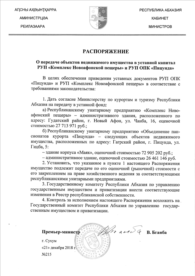 Распоряжение Кабинета Министров Республики Абхазия от 21.12.2018 № 215 "О передаче объектов недвижимого имущества в уставной капитал РУП "Комплекс Новоафонской пещеры" и РУП ОПК "Пицунда"