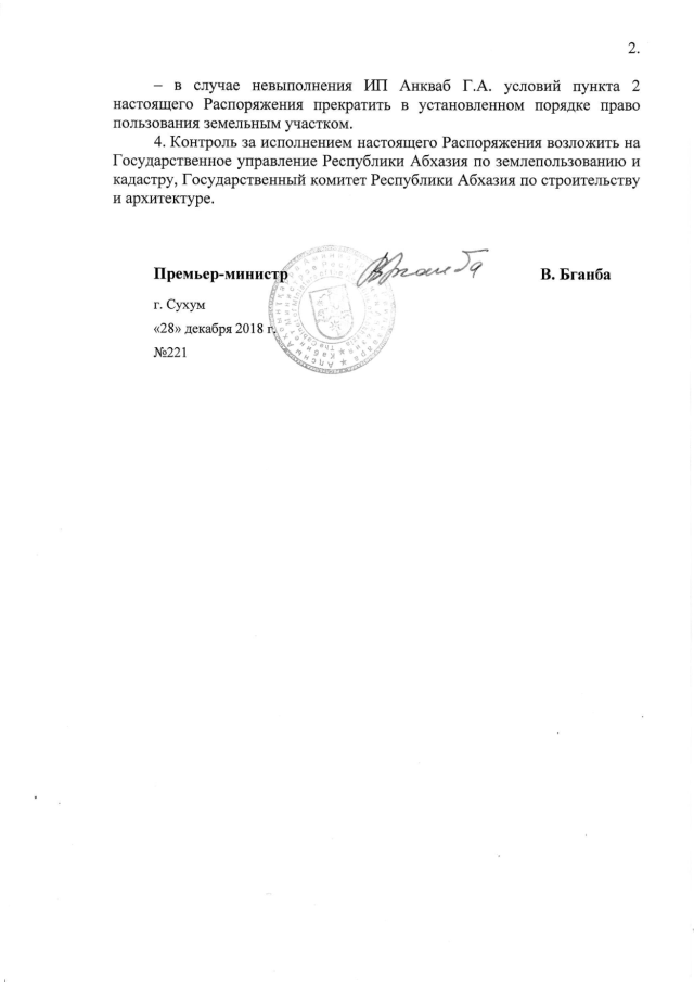 Распоряжение Кабинета Министров Республики Абхазия от 28.12.2018 № 221 "О даче согласия Администрации Гудаутского района на предоставление ИП Анкваб Г.А. 0,03 га земли в с. Приморское для строительства гостиницы"