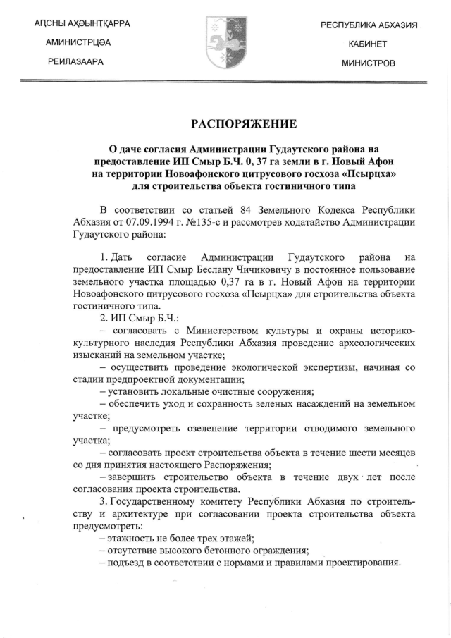 Распоряжение Кабинета Министров Республики Абхазия от 28.12.2018 № 222 "О даче согласия Администрации Гудаутского района на предоставление ИП Смыр Б.Ч. О, 37 га земли в г. Новый Афон на территории Новоафонского цитрусового госхоза "Псырцха" для строительства объекта гостиничного типа"