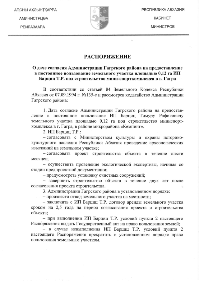 Распоряжение Кабинета Министров Республики Абхазия от 28.12.2018 № 224 "О даче согласия Администрации Гагрского района на предоставление в постоянное пользование земельного участка площадью 0,12 га ИП Барциц Т.Р. под строительство мини-спорткомплекса в г. Гагра"