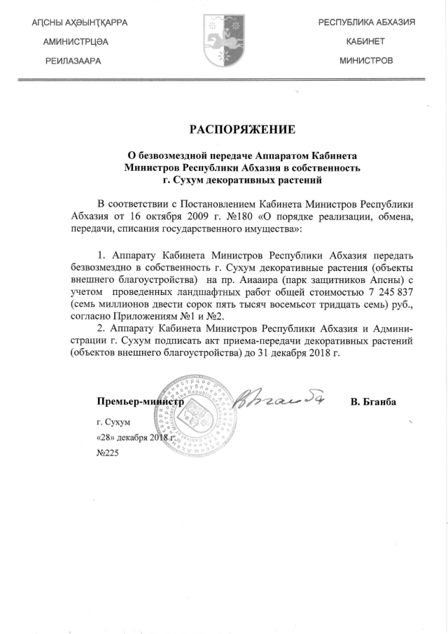 Распоряжение Кабинета Министров Республики Абхазия от 28.12.2018 № 225 "О безвозмездной передаче Аппаратом Кабинета Министров Республики Абхазия в собственность г. Сухум декоративных растений"