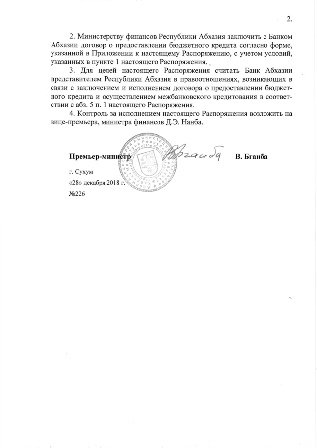 Распоряжение Кабинета Министров Республики Абхазия от 28.12.2018 № 226 "О предоставлении бюджетного кредита Национальному банку Республики Абхазия"