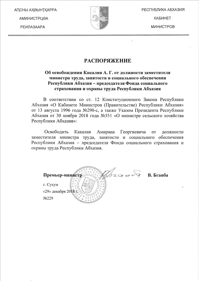 Распоряжение Кабинета Министров Республики Абхазия от 29.12.2018 № 229 "Об освобождении Какалия А.Г. от должности заместителя министра труда, занятости и социального обеспечения Республики Абхазия - председателя Фонда социального страхования и охраны труда Республики Абхазия"