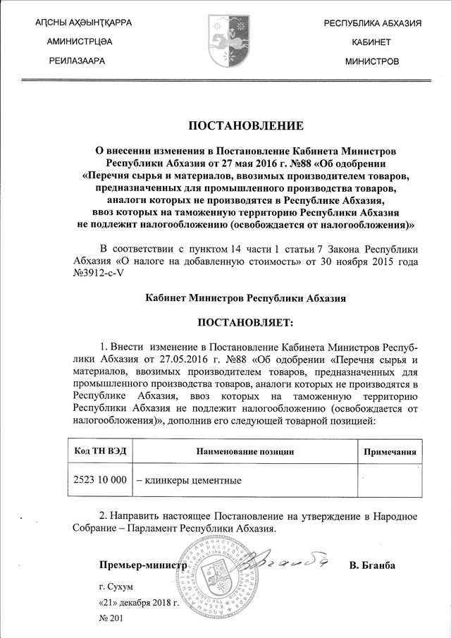 Постановление Кабинета Министров Республики Абхазия от 21.12.2018 № 201 "О внесении изменения в Постановление Кабинета Министров Республики Абхазия от 27 мая 2016 г. № 88 "Об одобрении "Перечня сырья и материалов, ввозимых производителем товаров, предназначенных для промышленного производства товаров, аналоги которых не производятся в Республике Абхазия, ввоз которых на таможенную территорию Республики Абхазия не подлежит налогообложению (освобождается от налогообложения)"