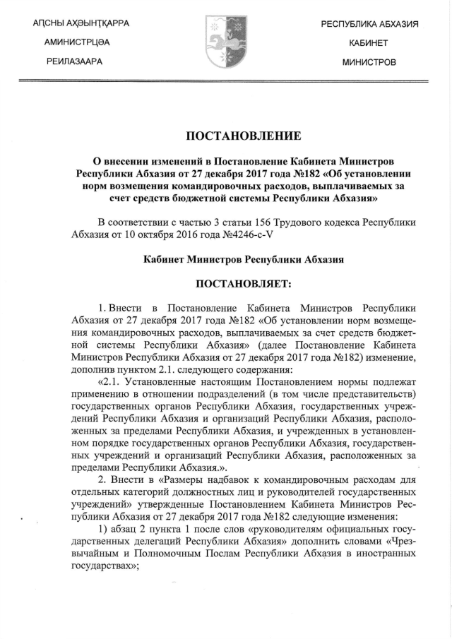 Постановление Кабинета Министров Республики Абхазия от 21.12.2018 № 204 "О внесении изменений в Постановление Кабинета Министров Республики Абхазия от 27 декабря 2017 года № 182 "Об установлении норм возмещения командировочных расходов, выплачиваемых за счет средств бюджетной системы Республики Абхазия"