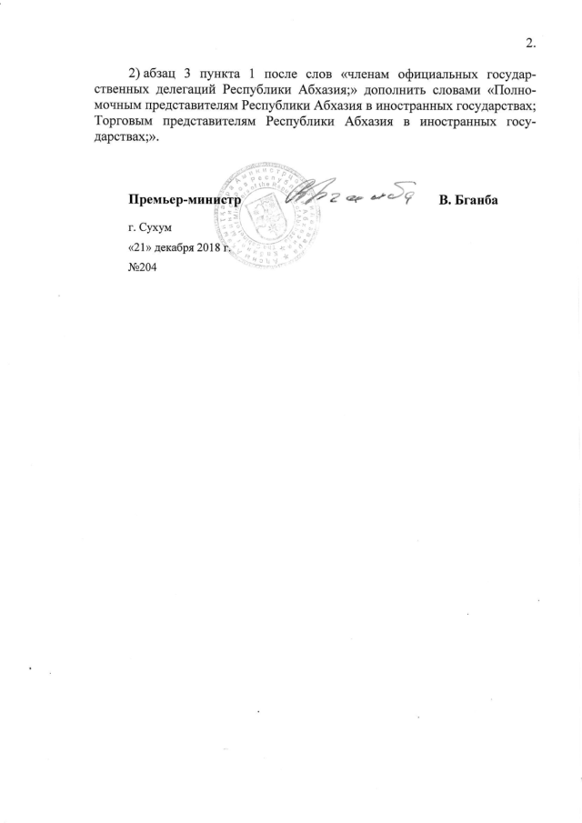 Постановление Кабинета Министров Республики Абхазия от 21.12.2018 № 204 "О внесении изменений в Постановление Кабинета Министров Республики Абхазия от 27 декабря 2017 года № 182 "Об установлении норм возмещения командировочных расходов, выплачиваемых за счет средств бюджетной системы Республики Абхазия"
