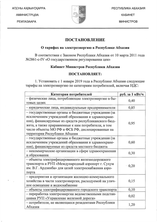 Постановление Кабинета Министров Республики Абхазия от 21.12.2018 № 200 "О тарифах на электроэнергию в Республике Абхазия"