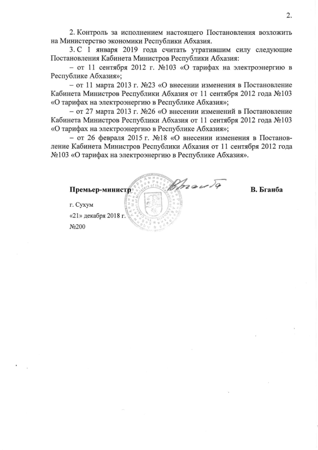 Постановление Кабинета Министров Республики Абхазия от 21.12.2018 № 200 "О тарифах на электроэнергию в Республике Абхазия"