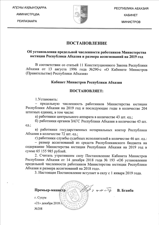 Постановление Кабинета Министров Республики Абхазия от 21.12.2018 № 208 "Об установлении предельной численности работников Министерства юстиции Республики Абхазия и размера ассигнований на 2019 год"