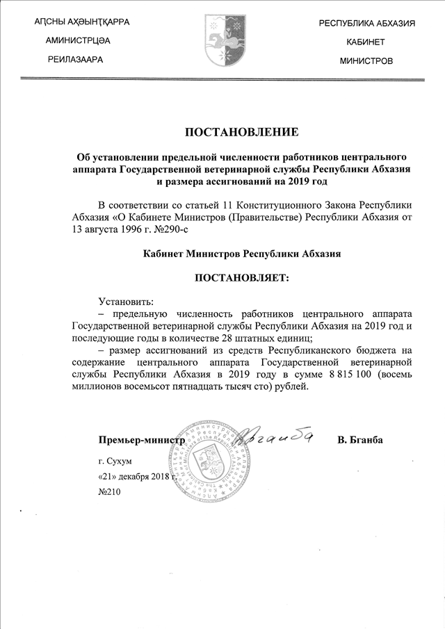 Постановление Кабинета Министров Республики Абхазия от 21.12.2018 № 210 "Об установлении предельной численности работников центрального аппарата Государственной ветеринарной службы Республики Абхазия и размера ассигнований на 2019 год"