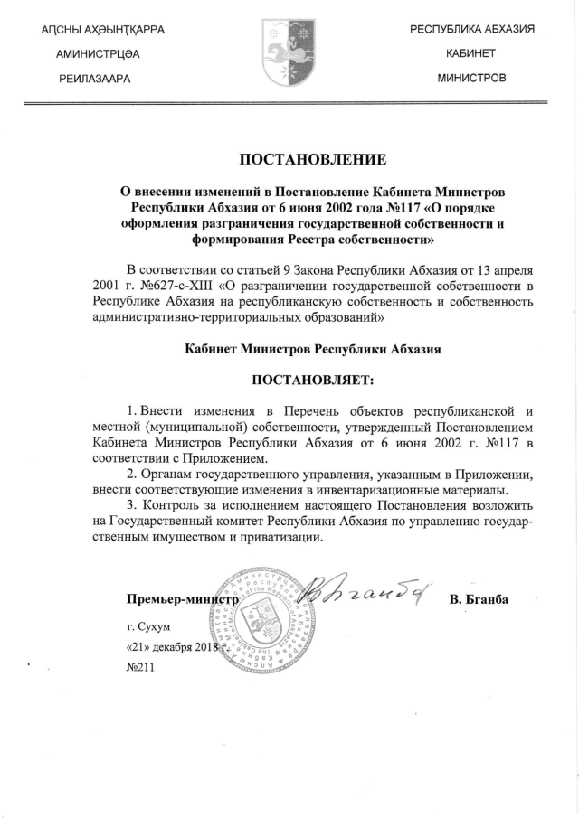 Постановление Кабинета Министров Республики Абхазия от 21.12.2018 № 211 "О внесении изменений в Постановление Кабинета Министров Республики Абхазия от 6 июня 2002 года № 117 "О порядке оформления разграничения государственной собственности и формирования Реестра собственности"