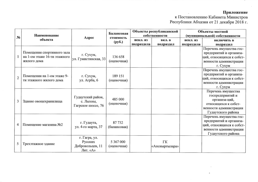 Постановление Кабинета Министров Республики Абхазия от 21.12.2018 № 211 "О внесении изменений в Постановление Кабинета Министров Республики Абхазия от 6 июня 2002 года № 117 "О порядке оформления разграничения государственной собственности и формирования Реестра собственности"
