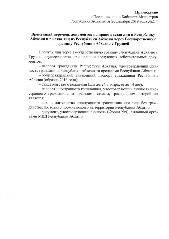 Постановление Кабинета Министров Республики Абхазия от 26.12.2018 № 214 "О внесении изменений в Постановление Кабинета Министров Республики Абхазия от 25 сентября 2012 года № 125 "Об утверждении "Временного перечня документов на право въезда лиц в Республику Абхазия и выезда лиц из Республики Абхазия через Государственную границу Республики Абхазия с Грузией"