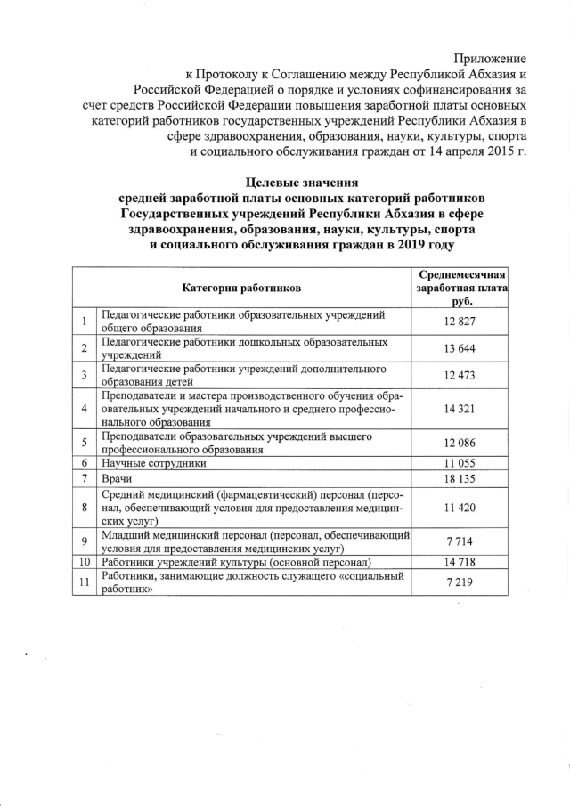 Постановление Кабинета Министров Республики Абхазия от 27.12.2018 № 216 "О проекте Протокола к Соглашению между Республикой Абхазия и Российской Федерацией о порядке и условиях софинансирования за счет средств Российской Федерации повышения заработной платы основных категорий работников государственных учреждений Республики Абхазия в сфере здравоохранения, образования, науки, культуры, спорта и социального обслуживания граждан от 14 апреля 2015 г."