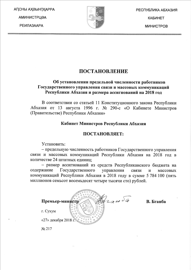 Постановление Кабинета Министров Республики Абхазия от 27.12.2018 № 217 "Об установлении предельной численности работников Государственного управления связи и массовых коммуникаций Республики Абхазия и размера ассигнований на 2018 год"
