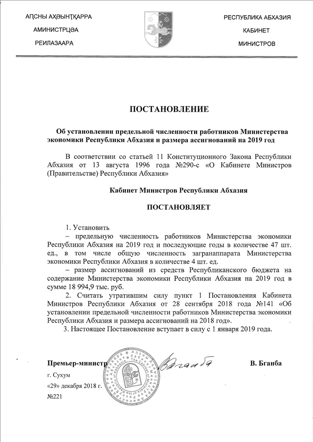 Постановление Кабинета Министров Республики Абхазия от 29.12.2018 № 221 "Об установлении предельной численности работников Министерства экономики Республики Абхазия и размера ассигнований на 2019 год"