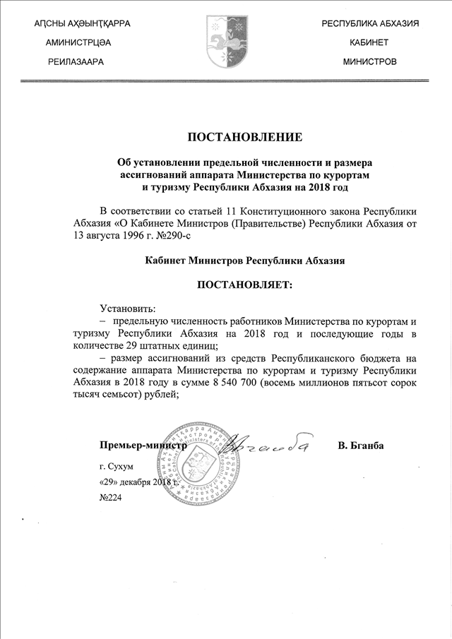 Постановление Кабинета Министров Республики Абхазия от 29.12.2018 № 224 "Об установлении предельной численности и размера ассигнований аппарата Министерства по курортам и туризму Республики Абхазия на 2018 год"