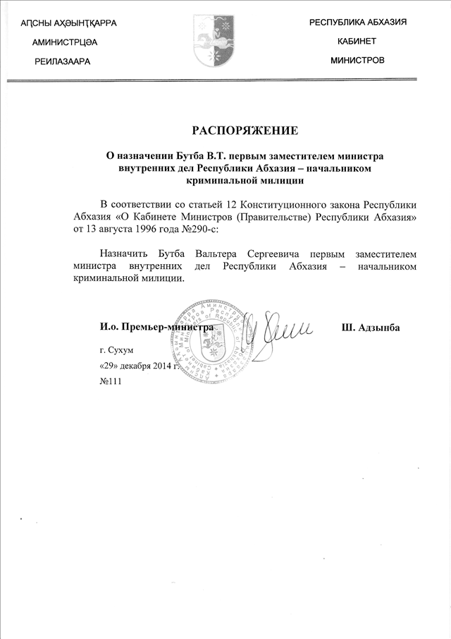 Распоряжение Кабинета Министров Республики Абхазия от 29.12.2014 № 111 "О назначении Бутба В.Т. первым заместителем министра внутренних дел Республики Абхазия - начальником криминальной милиции"