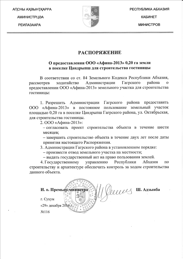 Распоряжение Кабинета Министров Республики Абхазия от 29.12.2014 № 116 "О предоставлении ООО "Афина-2013" 0,20 га земли в поселке Цандрыпш для строительства гостиницы"