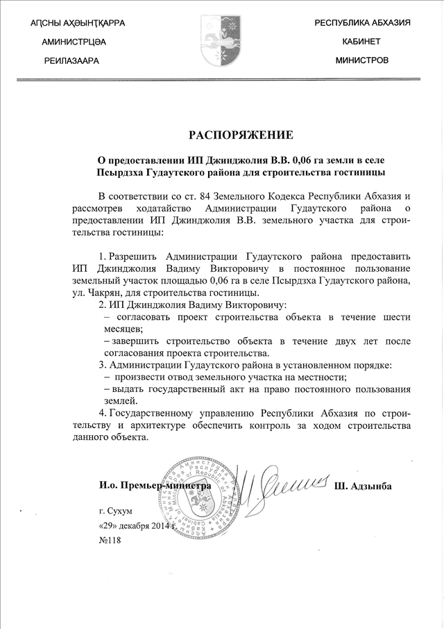 Распоряжение Кабинета Министров Республики Абхазия от 29.12.2014 № 118 "О предоставлении ИП Джинджолия В.В. 0,06 га земли в селе Псырдзха Гудаутского района для строительства гостиницы"
