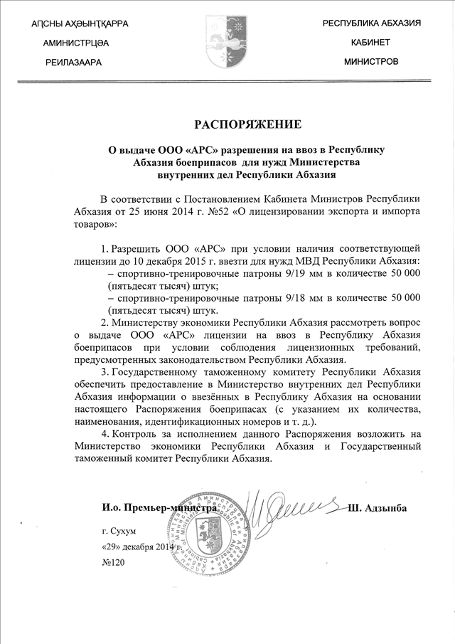 Распоряжение Кабинета Министров Республики Абхазия от 29.12.2014 № 120 "О выдаче ООО "АРС" разрешения на ввоз в Республику Абхазия боеприпасов для нужд Министерства внутренних дел Республики Абхазия"