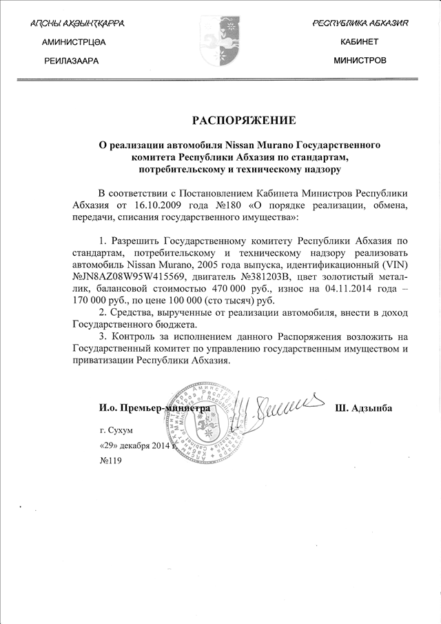 Распоряжение Кабинета Министров Республики Абхазия от 29.12.2014 № 119 "О реализации автомобиля Nissan Murano Государственного комитета Республики Абхазия по стандартам, потребительскому и техническому надзору"