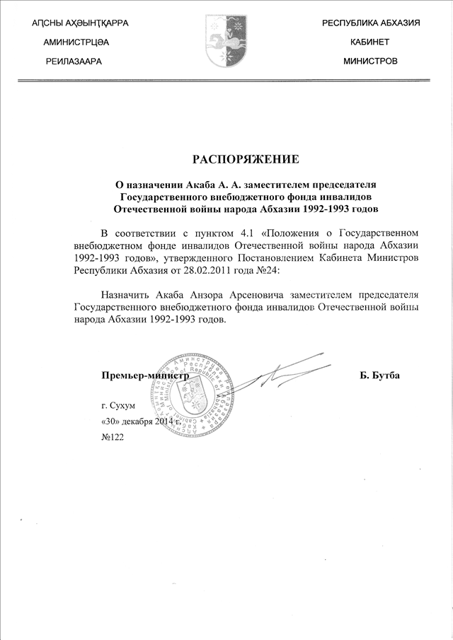 Распоряжение Кабинета Министров Республики Абхазия от 30.12.2014 № 122 "О назначении Акаба А.А. заместителем председателя Государственного внебюджетного фонда инвалидов Отечественной войны народа Абхазии 1992-1993 годов"
