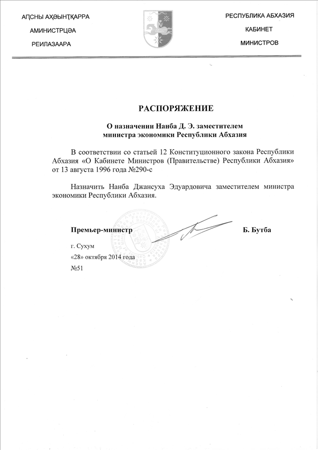 Распоряжение Кабинета Министров Республики Абхазия от 28.10.2014 № 51 "О назначении Нанба Д.Э. заместителем министра экономики Республики Абхазия"