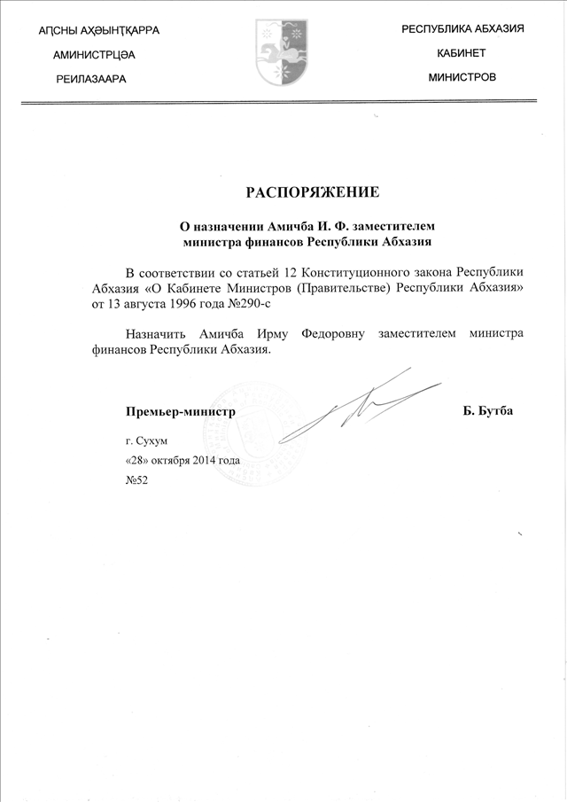 Распоряжение Кабинета Министров Республики Абхазия от 28.10.2014 № 52 "О назначении Амичба И.Ф. заместителем министра финансов Республики Абхазия"