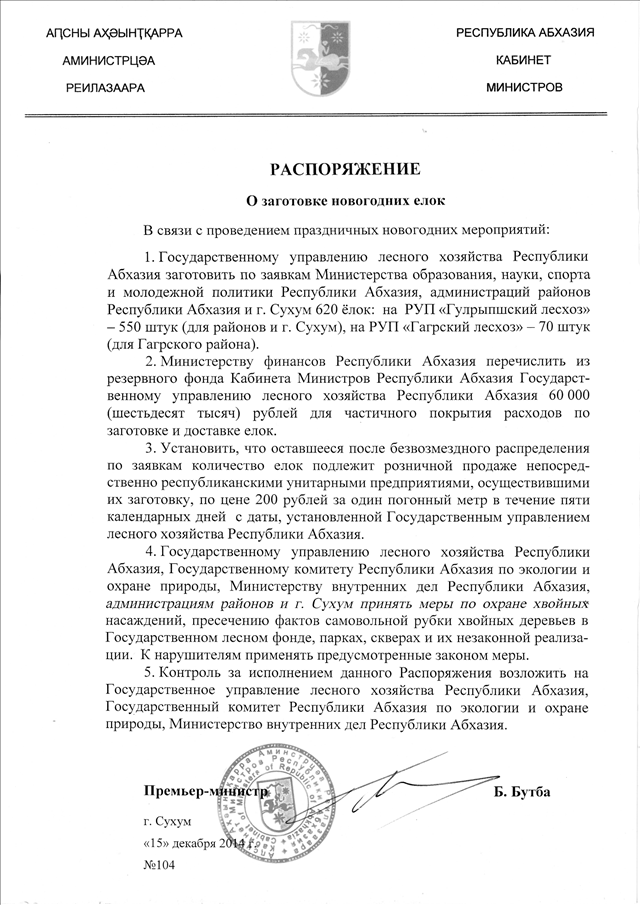 Распоряжение Кабинета Министров Республики Абхазия от 15.12.2014 № 104 "О заготовке новогодних елок"