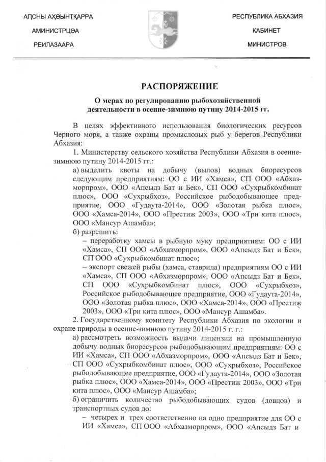 Распоряжение Кабинета Министров Республики Абхазия от 19.12.2014 № 107 "О мерах по регулированию рыбохозяйственной деятельности в осенне-зимнюю путину 2014-2015 гг."