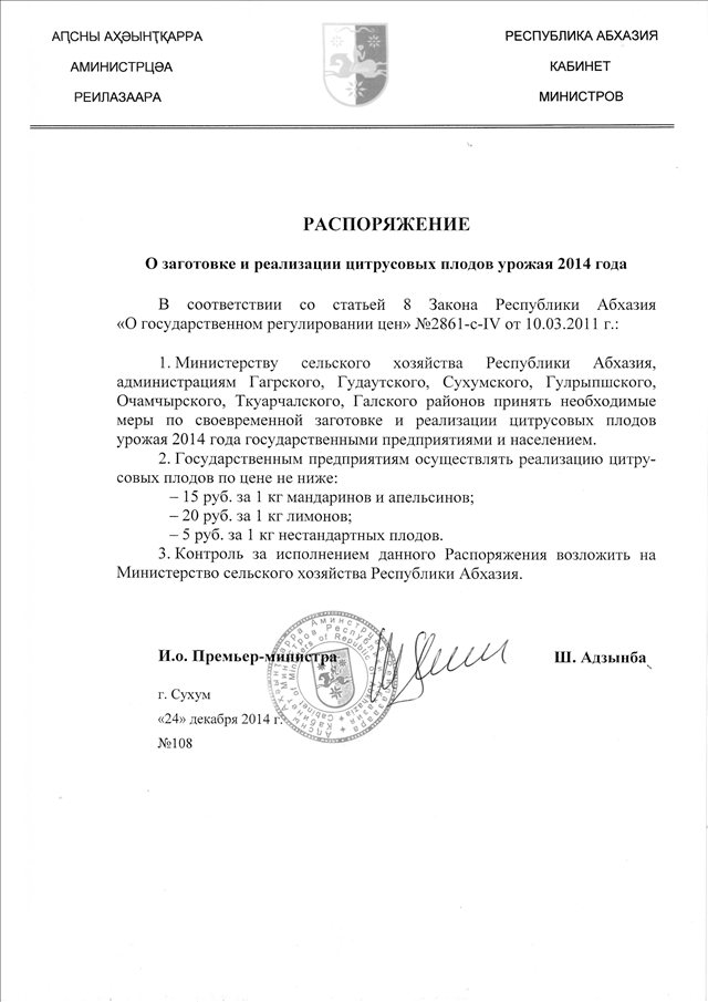 Распоряжение Кабинета Министров Республики Абхазия от 24.12.2014 № 108 "О заготовке и реализации цитрусовых плодов урожая 2014 года"