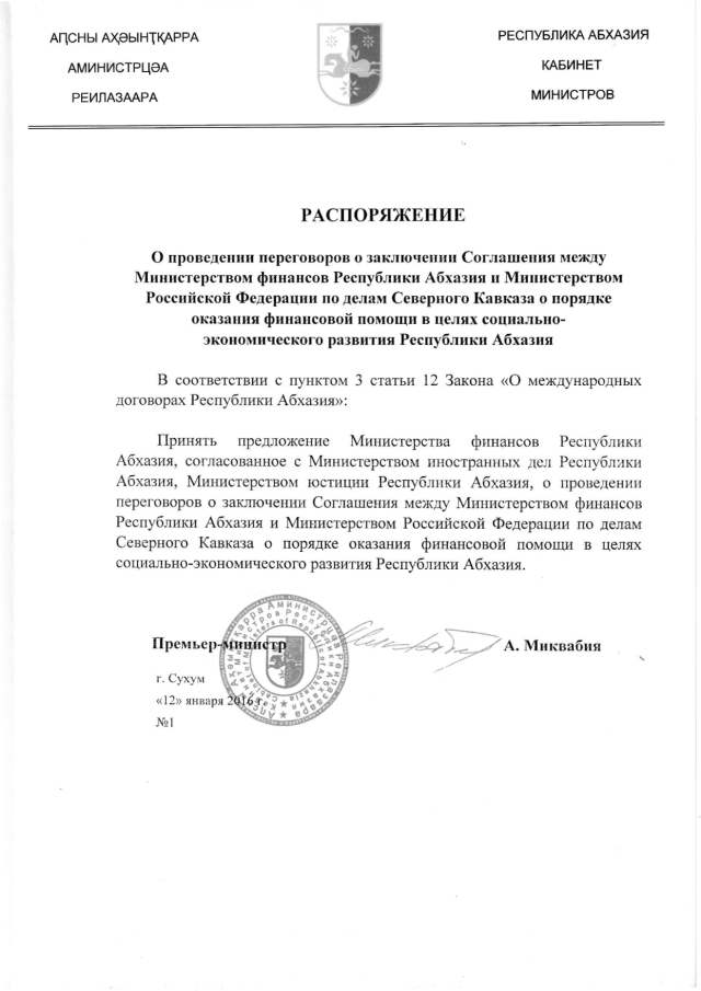 Распоряжение Кабинета Министров Республики Абхазия от 12.01.2016 № 1 "О проведении переговоров о заключении Соглашения между Министерством финансов Республики Абхазия и Министерством Российской Федерации по делам Северного Кавказа о порядке оказания финансовой помощи в целях социальноэкономического развития Республики Абхазия"