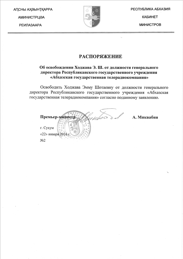 Распоряжение Кабинета Министров Республики Абхазия от 22.01.2016 № 2 "Об освобождении Ходжава Э.Ш. от должности генерального директора Республиканского государственного учреждения <Абхазская государственная телерадиокомпания"