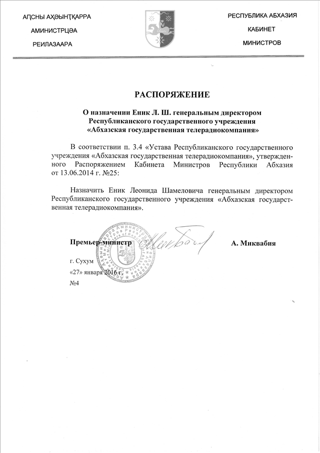 Распоряжение Кабинета Министров Республики Абхазия от 27.01.2016 № 4 "О назначении Еник Л.Ш. генеральным директором Республиканского государственного учреждения "Абхазская государственная телерадиокомпания"