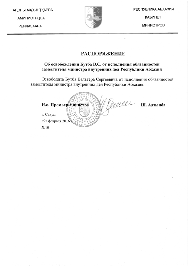 Распоряжение Кабинета Министров Республики Абхазия от 09.02.2016 № 10 "Об освобождении Бутба В.С. от исполнения обязанностей заместителя министра внутренних дел Республики Абхазия"