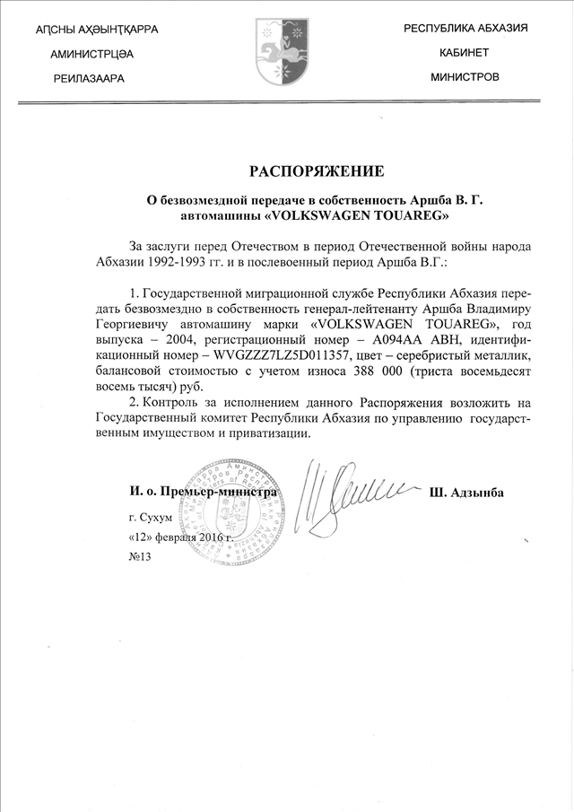 Распоряжение Кабинета Министров Республики Абхазия от 12.02.2016 № 13 "О безвозмездной передаче в собственность Аршба В.Г. автомашины
