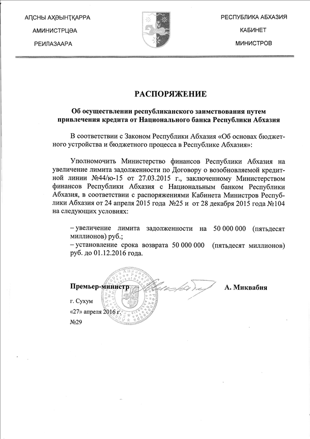 Распоряжение Кабинета Министров Республики Абхазия от 27.04.2016 № 29 "Об осуществлении республиканского заимствования путем привлечения кредита от Национального банка Республики Абхазия"